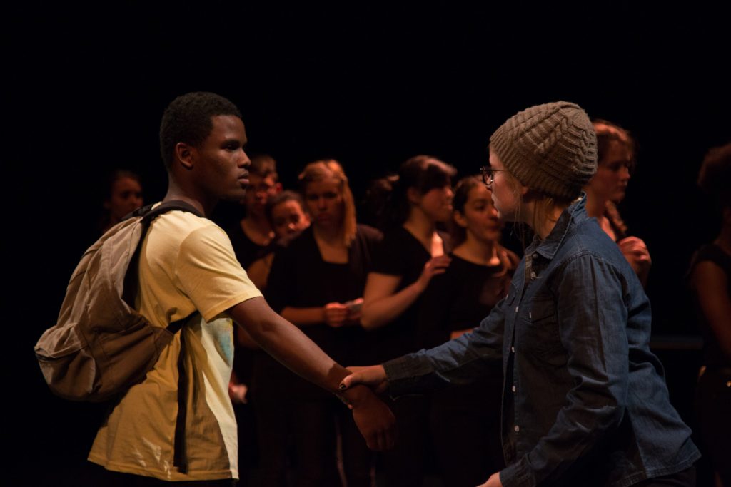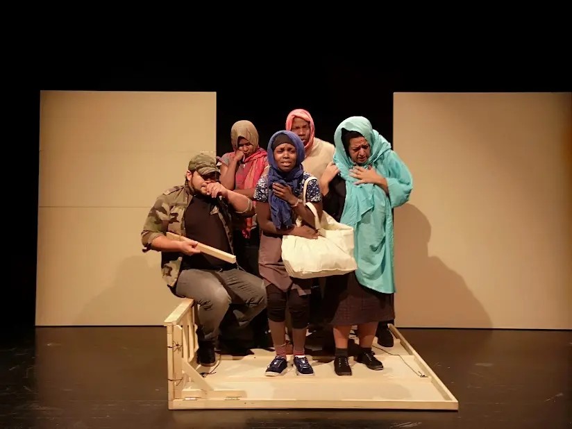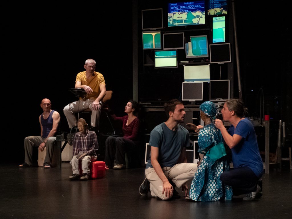Le texte de Simon Grangeat est porté pour l’essentiel par un chœur, le chœur des interprètes formé de tous les personnages qui vont tour à tour intervenir. Il raconte, commente, interpelle les protagonistes. Pour faire de cette double aventure un récit exemplaire, une épopée, presque un conte. Le chœur semble veiller sur ces deux enfants remplis d’espoir, persuadés que le monde ne peut pas être si dur et si laid. Et que rien n’est perdu tant qu’il y a l’envie de s’en sortir. Ils arriveront finalement en Europe, en Espagne, dans l’enclave de Melilla. Tout semble désormais leur sourire. Et pourtant : « Tu crois que ton voyage est terminé ?/ En fait, c’est presque le début de tes ennuis. / On t’enferme dans un centre d’internement./ Entre nous, on appelle ça le centre de déportation. » La fin du texte nous rappelle que tous ces gens qui fuient leur pays ne sont pas toujours les bienvenus, loin de là. Que la traversée pour gagner le continent européen n’est que la première étape d’un parcours très difficile. Et que de nouvelles épreuves les attendent dans cette richissime Europe où l’étranger est perçu comme une menace permanente.