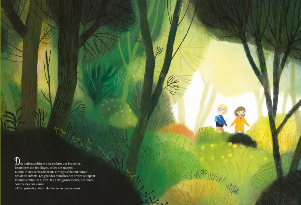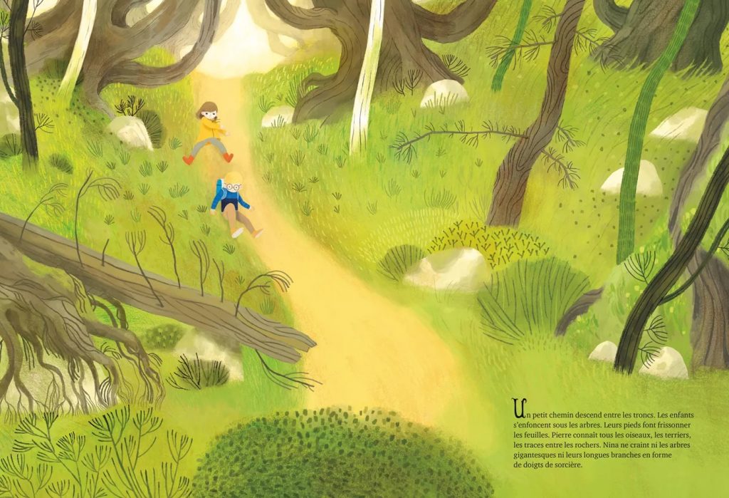Les illustrations occupent toutes les pages, elles sont douces et le camaïeu de vert utilisé par Cédric Abt met magnifiquement en scène la forêt, dans laquelle les enfants sont tout petits. Il y a un bel équilibre dans les planches et dans le propos de Simon Grangeat entre onirisme (les chants ancestraux pour communiquer avec la nature transmis par la grand-mère) et description de la nature (Pierre qui explique ce qui constitue une forêt, des coléoptères aux mousses). À lire pour la rencontre des deux mondes et pour la dynamique entre les enfants.