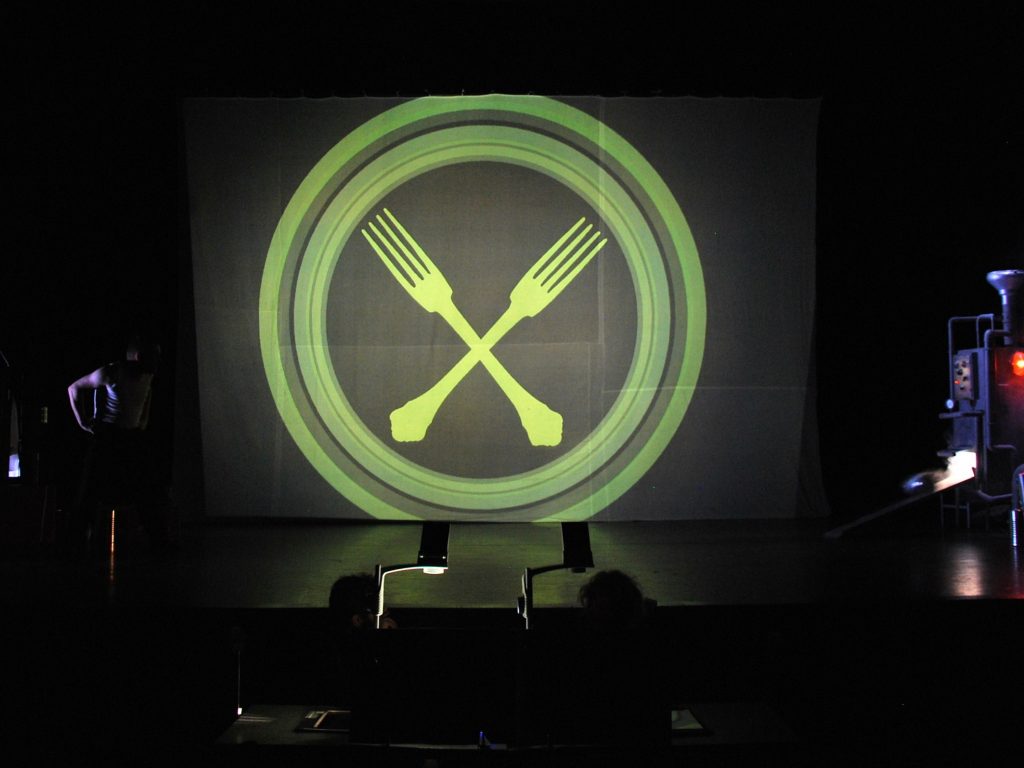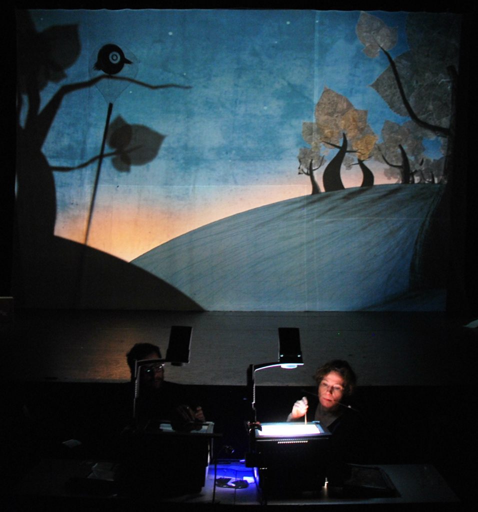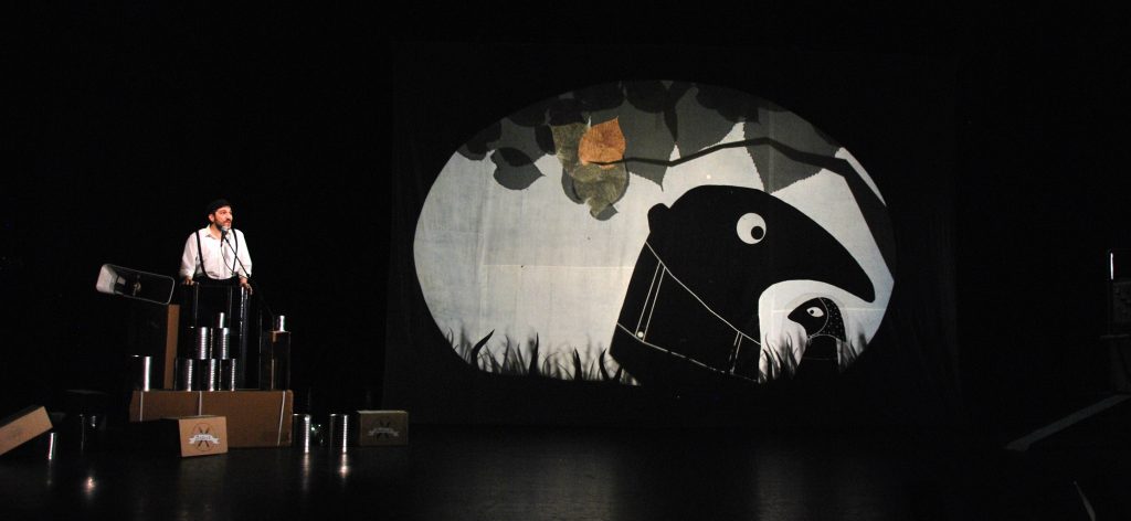 Plus radicalement, c’est l’Ogre lui-même, que met en scène Simon Grangeat dans Un caillou dans la botte (2011), en la personne de Nikolaï Ogrovsky, qui « pour la première fois, prend la parole publiquement » pour « raconter son histoire, dire sa vérité », à la manière d’une enquête policière ou d’un procès criminel. Ce spectacle d’ombres mêlé de marionnettes, de maquettes, d’objets, « change le point de vue initial du conte et adopte, pour une fois, le regard de l’Ogre, ainsi qu’un peu de sa mauvaise foi ». Autrement dit, l’Ogre est présenté sous la forme d’un « brave carnivore, certes légèrement cannibale », « volé, dupé, ruiné, et ce en une seule nuit, par un misérable rejeton ». Dès la scène d’ouverture, le récitant, sous les traits duquel transparaît l’Ogre, prétend apporter un démenti public aux allégations frauduleuses du conte et en propose le travestissement burlesque. Le récitant intervient ensuite de façon récurrente en appui de l’action des parents, qu’il compare à « des vraies crapules, des vauriens, des moi-moi égoïstes ». Il en propose un commentaire décalé, tout en filant la métaphore de la dévoration : « Pensez de moi ce qui vous chante, mais le mensonge, jamais. Faire des choses pareilles à ses propres enfants, la chair de sa chair, le sang de son sang ! Le sang… »